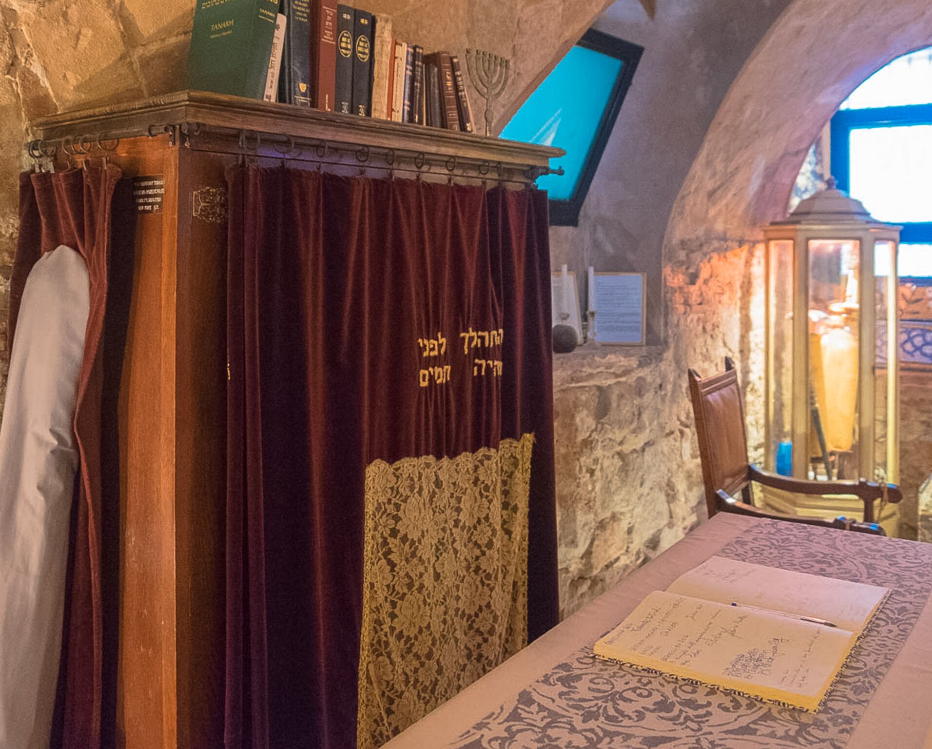 The building is a combination of different eras. The first room has a Roman wall at its base, with a stone inscribed “XIIX” from the second century, as well as a medieval well from when the space was used for dying cloth. The second room that became the worship space was added in the 13th century. It has niches in two walls that face east to Jerusalem for placing Torahs. The worship room is home to a donated 500-year-old Torah along with different collections of artifacts from medieval times.