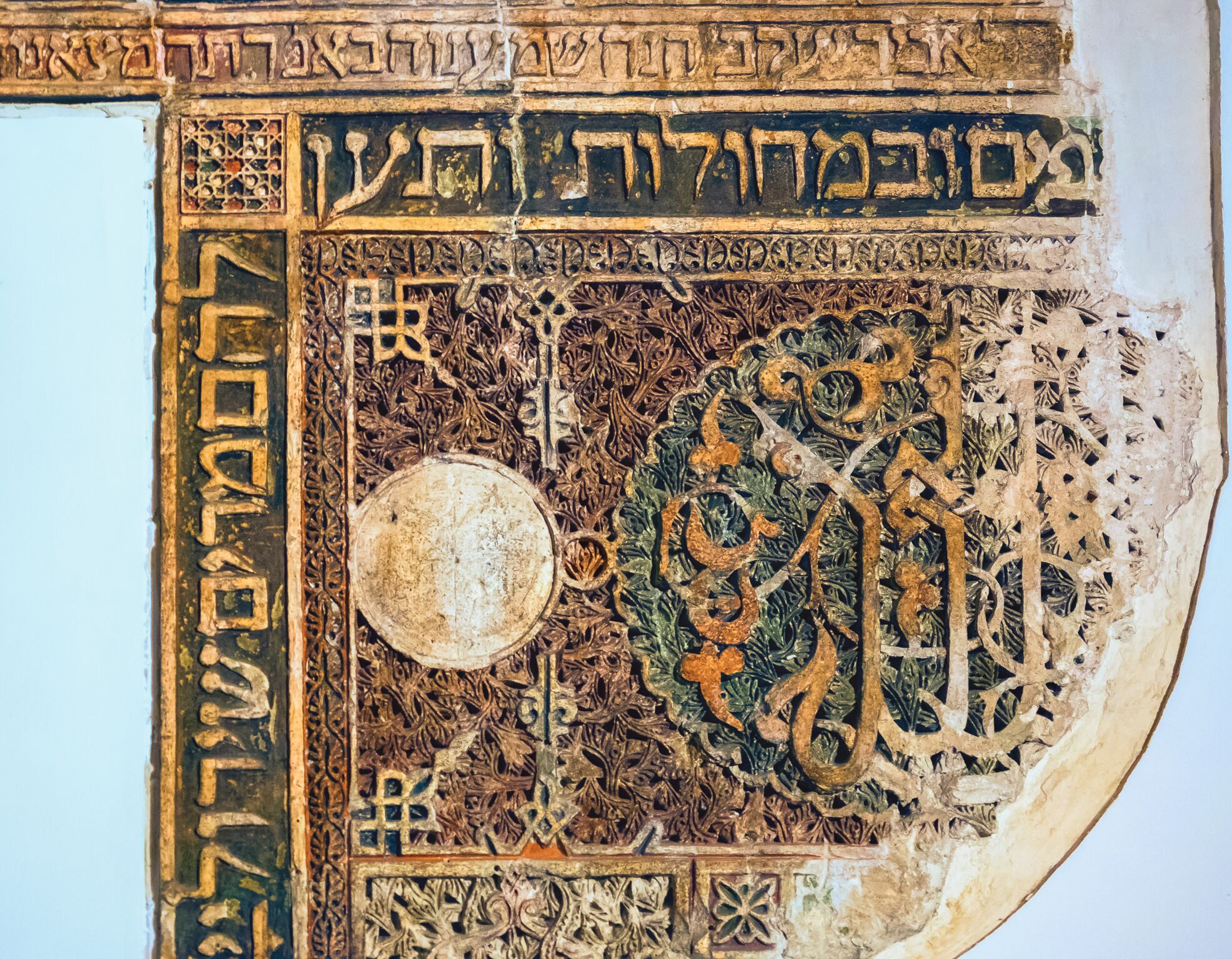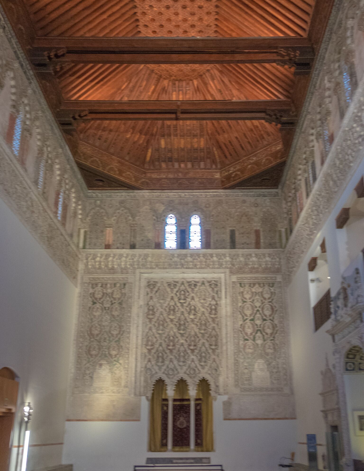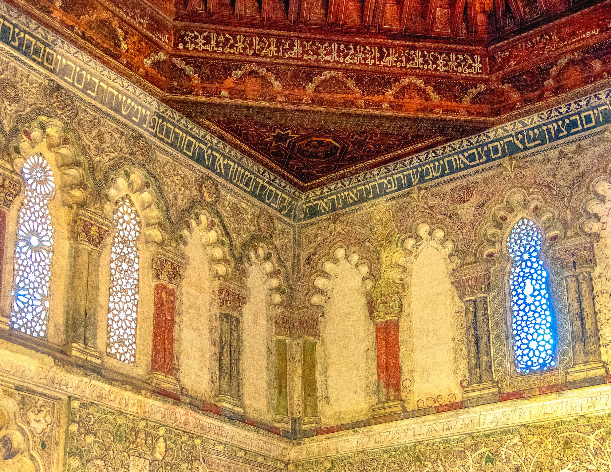 “Magnificent” is a one-word description for the El Transito Synagogue, which now operates as the Sephardic Museum. The El Transito synagogue, built about 1356, was the private family synagogue of Samuel ha-Levi Abulafi, Treasurer to Pedro of Castile (also known as Pedro the Cruel). The king gave ha-Levi his assent for the exception from the laws that a synagogue must be smaller, lower and plainer than any church in the realm. While the synagogue is not remarkable in its exterior, its interior is an architectural triumph, integrating tile floors with walls covered by polychrome Hebrew quotations from the Psalms, praises for ha-Levi’s patron, King Pedro, and not inconspicuously, for ha-Levi, himself. These monumental inscribed friezes are considered the best examples of their type in the world and works of art on their own. Its arched windows let in light and are topped by a massive, decorated paneled ceiling. Everything about the building reveals a time of an easier co-existence of the three cultures of Judaism, Christianity and Islam. El Transito was built by a wealthy, highly positioned Jew in the Christian court, sanctioned by the Christian king, and crafted by Muslim architects and skilled workmen.