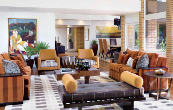 Most of the furnishings throughout the home are custom pieces by the designers, such as the living room’s leather bench with visible seat rails and movable bolster pillows. The designers used a color palette of cream, charcoal and chocolate with rust and copper accents, and designed furnishings that reflect many of the architectural details such as the geometric design of the silk-and-wool area rug and a pair of stepped square coffee tables that mimic the windows.
